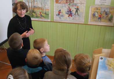 Н.С. Парфенова представляет юным посетителям выставки работы своих выпускников.