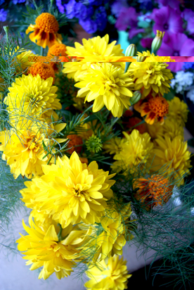 «Солнышки» из жёлтых бархатцев, «Верные подруги» из разноцветных игольчатых астр, «Рижские красавчики» - жёлтые однолетние георгины, «Восемь девок, один я» - астры и один гладиолус – принесла на выставку Алевтина Геннадьевна Киселёва.