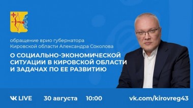 Во вторник, 30 августа, в 10:00, врио губернатора Кировской области Александр Соколов обратится к депутатам Законодательного Собрания Кировской области, руководителям органов местного самоуправления, общественным и политическим объединениям и жителям региона с обращением «О социально-экономической ситуации в области и задачах на среднесрочную перспективу».