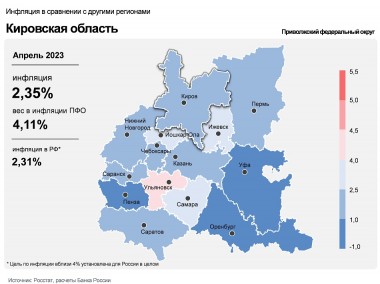 Годовая инфляция в Кировской области в апреле 2023 года замедлилась до 2,35% после 3,60% в марте.Это выше, чем в Приволжском федеральном округе (1,43%) и в целом в России (2,31%). Замедление инфляции в регионе, как и в целом по стране, в основном объясняется статистическим эффектом базы: в расчете годовой инфляции перестал учитываться прошлогодний весенний всплеск цен. Кроме эффекта высокой базы прошлого годана это также повлиялирасширение предложения и снижение давления со стороны издержек производителей ряда товаров.