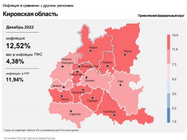 Годовая инфляция в Кировской области в декабре 2022 года ускорилась до 12,52% после 12,29% в ноябре. Это выше, чем в Приволжском федеральном округе (11,93%) и в целом в России (11,94%). Драйвером ускорения инфляции в регионе стало повышение тарифов на жилищно-коммунальные услуги.