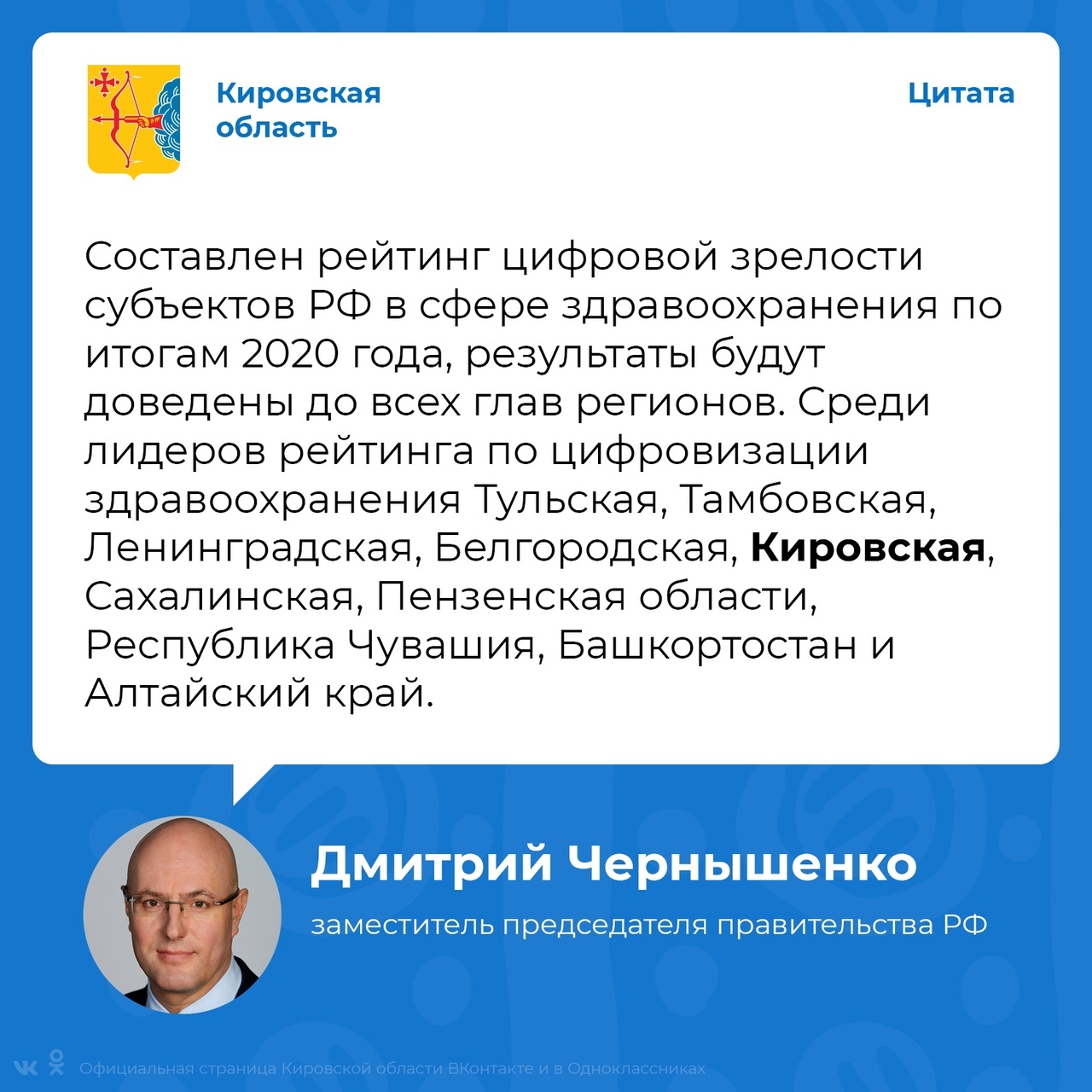 Кировская область вошла в число лидеров в рейтинге цифровой зрелости субъектов РФ в сфере здравоохранения по итогам 2020 года.