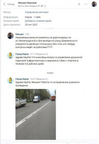 В течение того же дня его проинформировали, что его вопрос направили в Управление дорожной и парковой инфраструктуры и в течение нескольких рабочих дней дадут ответ. Уже спустя два рабочих дня пользователю сообщили, что разметку исправили, и приложили фото с участка, где были проблемы.