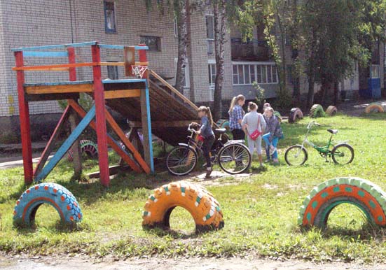 Всеми цветами радуги заиграли вкопанные в землю колёса, старая песочница и другие сооружения. Для самых маленьких детей сделали отдельную песочницу, установили шесть скамеек, на которых удобно отдыхать всем. Немного обновили оборудование: повесили спортивные кольца, поменяли качели и установили баскетбольную корзину. Начали ремонт горки, этот процесс пока остановился из-за отсутствия материала (его обещал позднее дать один из жильцов). Также скосили траву на площадке и вырубили деревья и кустарники около теплотрассы, причём всё это сразу же вывезли на своём тракторе.