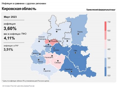 Годовая инфляция в Кировской области в марте 2023 года замедлилась до 3,60% после 11,63% в феврале.Это выше, чем в Приволжском федеральном округе (2,66%) и в целом в России (3,51%). Замедление инфляции в регионе, как и в целом по стране, в основном объясняется статистическим эффектом базы – в расчете годовой инфляции перестал учитываться прошлогодний мартовский всплеск цен.Кроме эффекта высокой базы прошлого года на это также повлияли сдержанная потребительская активность граждан,расширение предложения и снижение давления со стороны издержек производителей ряда товаров.