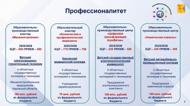 Ключевым проектом, направленным на развитие среднего профессионального образования и системы подготовки кадров для экономики, является федеральный проект «Профессионалитет». Ранее в Кировской области были открыты образовательные кластеры в отраслях «Машиностроение», «Медицина», «Сельское хозяйство». С нового учебного года начал работать кластер «Химическая отрасль».