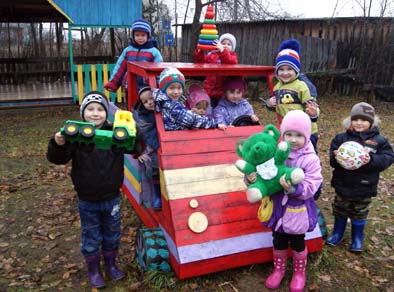 Однако только игровой площадкой дело не ограничилось. За счёт собственных средств и сил самые ответственные папы (кто в выходной день, а кто после работы) полностью отремонтировали пол и перекрыли крышу на летней веранде, построили на игровой площадке качели, «змейку» из ярких пенёчков разной высоты и большую разноцветную машину, в которой свободно «ездят» все 12 дошкольников вместе с воспитателями.