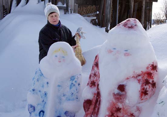 - Обычно во время оттепели я заготавливаю глыбы снега, из которых потом буду лепить скульптуры, - поясняет мастерица, - в морозец они становятся твёрдыми и прочными. А вырезанные фигуры изготавливаются из плотного, но не смёрзшегося снега. Укрепляла их тонкой ледяной корочкой, которая образуется после опрыскивания фигур водой из пульверизатора.