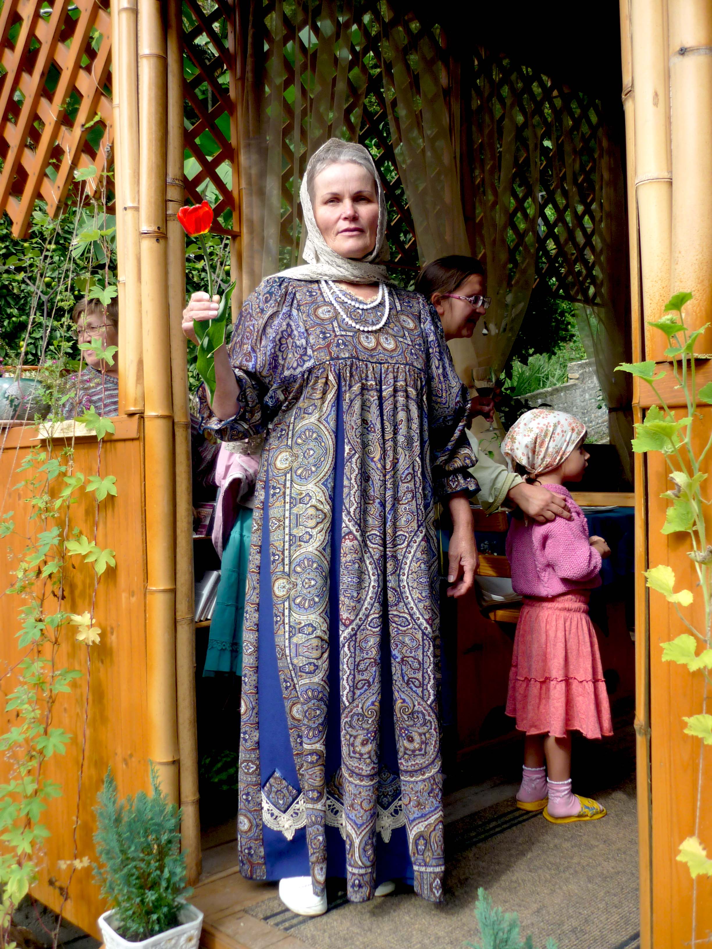 Впечатление от песни создает не только исполнительское мастерство поющего, а также обстановка и костюм. Недавно Наталия Евгеньевна приобрела для себя сшитое на основе павлопосадских платков платье авторской работы известного питерского модельера Елены Чернышовой. Она специализируется на создании одежды в этностиле – современной одежды с использованием русского народного кроя. Вот в это платье и нарядили Светлану Анатольевну. Видимо, образ получился настолько органичным, что хозяйка пошла дальше – она решила подарить его своей гостье на добрую память. Сейчас это платье Светлана Анатольевна бережно хранит, хотя признается, что очень хочется нарядиться и куда-нибудь пойти, но стесняется.