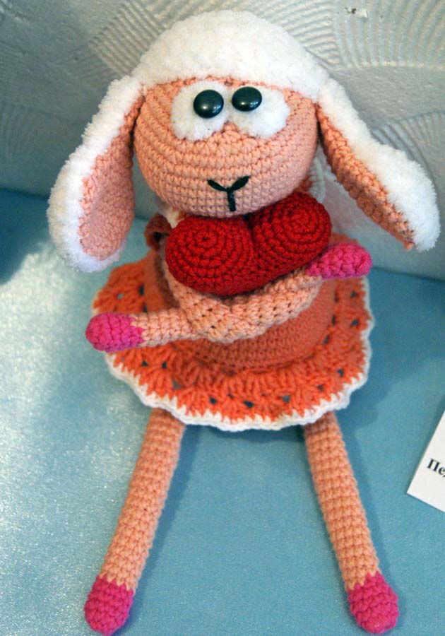 Кроме детской одежды Татьяна Васильевна любит вязать игрушки. Здесь мы видим очаровательную Каркушу из «Спокойной ночи, малыши», барашка с витыми рогами и милую овцу в платьице, которые стоят около нарядной ёлочки, также связанной крючком. Мишка, Леопард и Зайка напоминают о тех волнительных днях, которые пережила страна год назад, болея на нашей Олимпиаде за российских спортсменов. А вот мудрая сова, которая вяжет себе тёплый шарф, рядом разместились домовята, лошадка и собачка.